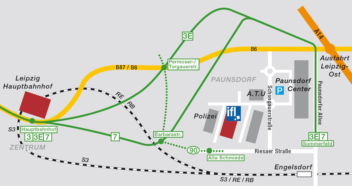 From the main station, take tram 3E or 7 to the final stop Sommerfeld. Walk through the Paunsdorf Center towards the Sachsen-Therme. The IfL is located diagonally across from the car repair shop.
